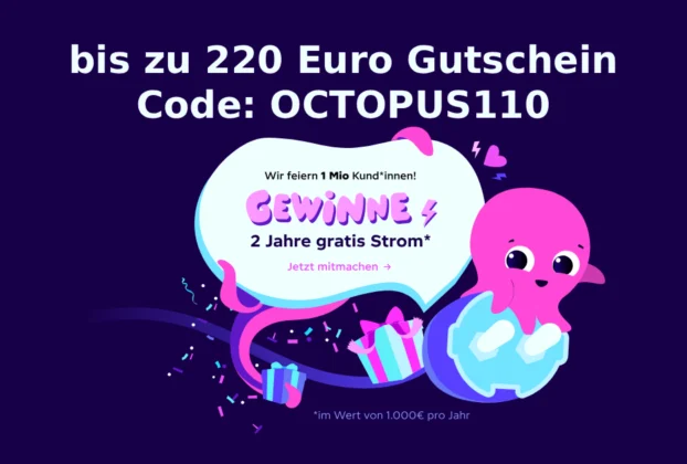 Mit dem Gutscheincode „OCTOPUS110“ erhältst du 110 € Bonus auf deine erste Jahresrechnung. Wer sich für einen Kombivertrag (z. B. Strom + Gas) entscheidet, bekommt sogar bis zu 220 € Bonus.